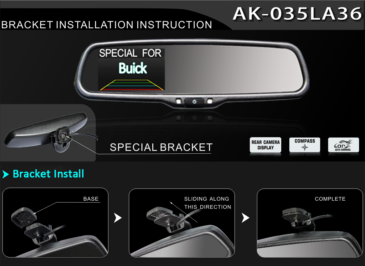 AK035LA36 special bracket rearview mirror monitor for HYUANDAI,KIA,GENERAL MOTOR.easy to install.and completely replace your original rearview mirror monitor.3.5inch high-brightness display