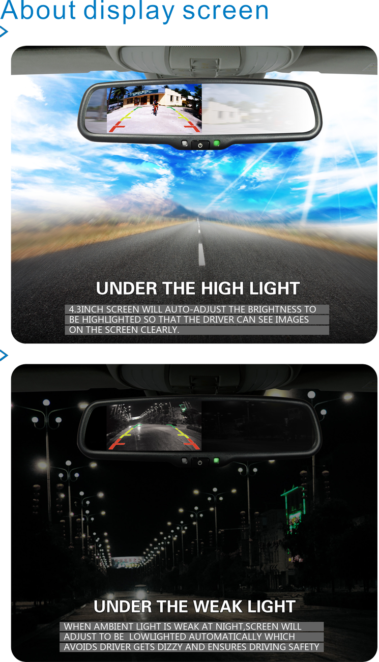 When your car gear is engaged, 4.3 inch HD TFT LCD monitor shows back up display automatically. Also it automatically