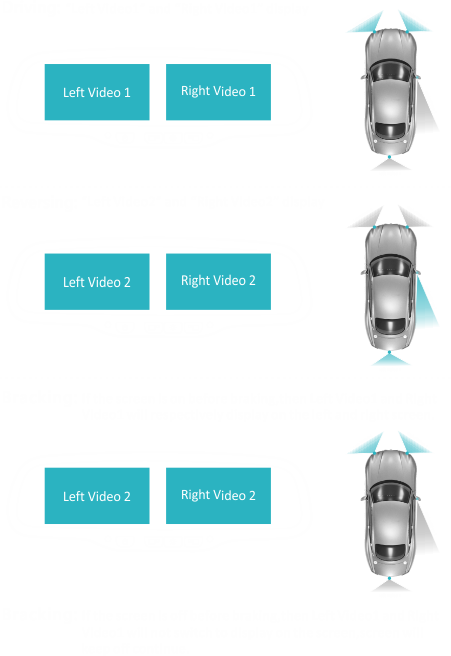 しかし、CTR1とCTR2が同時に電源を接続したとき、モニターの画面が、CTR1にだけ制御されます。(左ビデオ1、右ビデオ1)が表示されます。CTR2が電源に接続した場合、画面がオフに置ければ、モニターはオンとオフの間に止まらなくて変更します。画面がオンに置ければ、左右の画面が左ビデオ2と右ビデオ2に切り替わります。