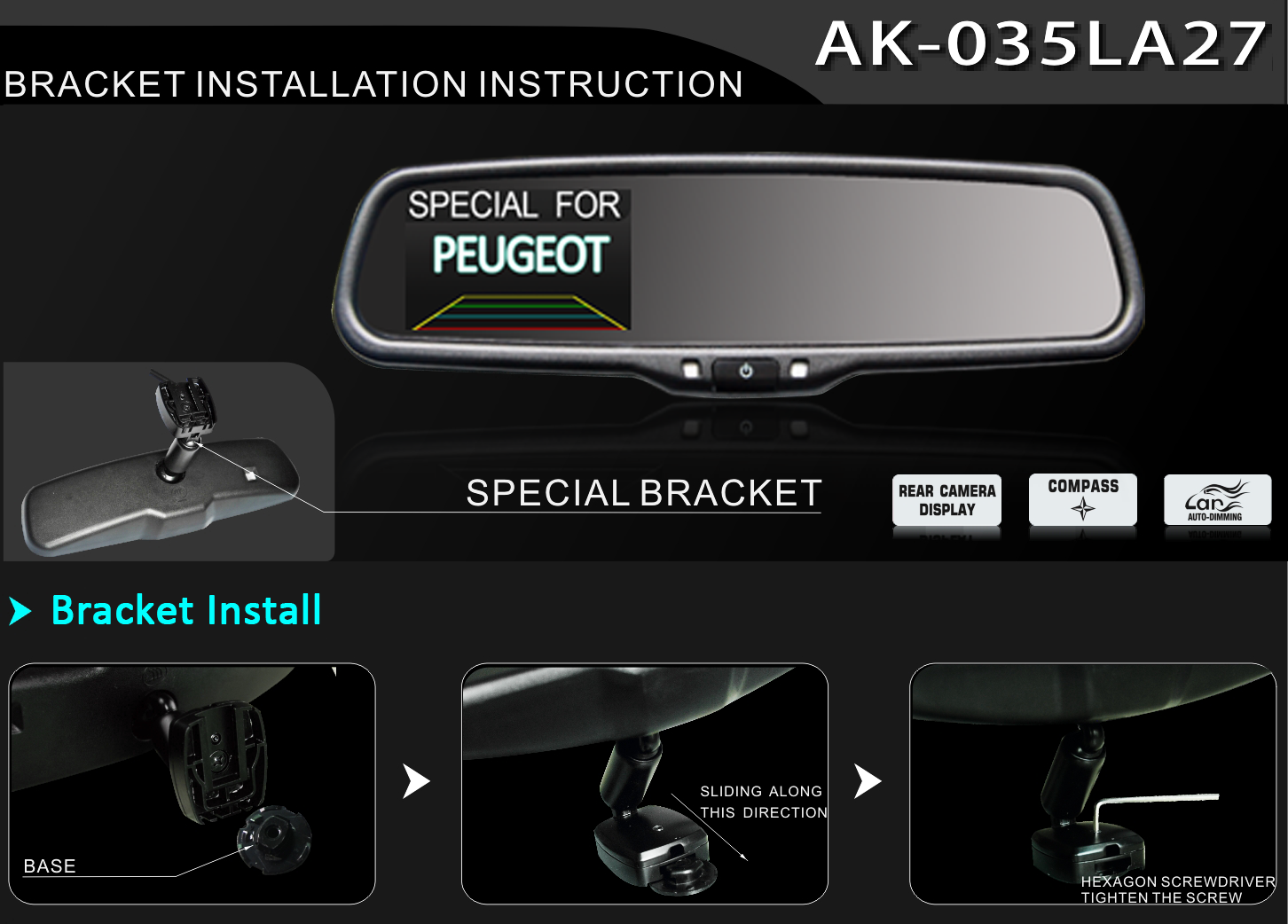 AK035LA27はPeugeot専用で特別なブラケットを配置するモニターリアビューミラーです。簡単にインストール、完璧に元のリアビューミラーを変えられます。3.5寸ハイブライトネススクリーンはミラーガラスの下に置きます。スクリーンカラーの整合性でミラー全体はきれいに見えます。