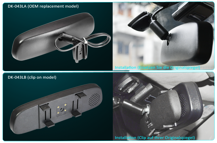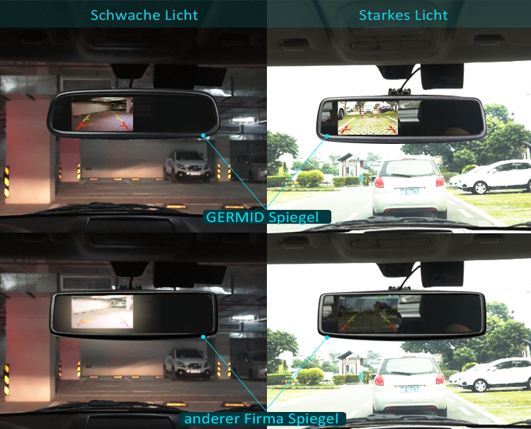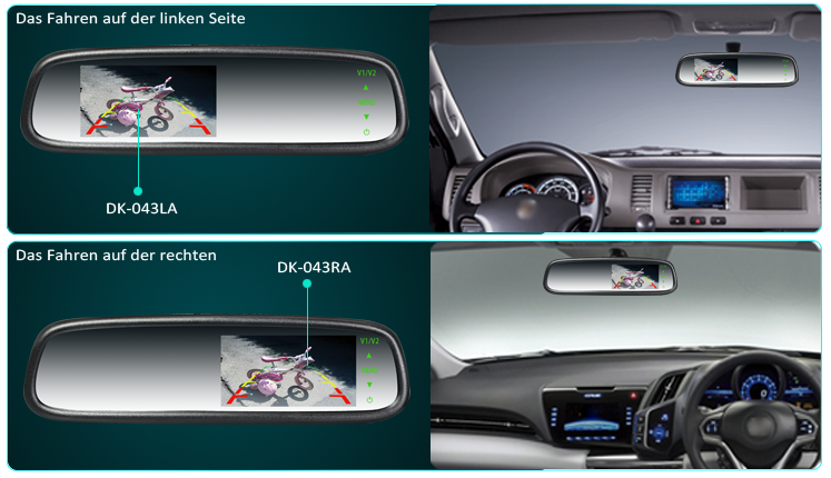 ►DK- 043LA / B ist der RCD- Spiegel , die von GERMID Besonderes für sichere Parkplätze ausgelegt ist. Es muss mit einer Backup- Kamera zu arbeiten, um Rückansicht anzuzeigen. Wenn Auto hinten Getriebe angewendet wird , wird die 4,3-Zoll- High-Brightness -Monitor der hinteren Ansicht automatisch angezeigt. Wenn Sie unter verschiedenen Licht fahren , wird die 4,3-Zoll- Monitor automatisch Helligkeit mit Umgebungslicht . Dann werden Sie sich wohl fühlen , um Rückansicht unter verschiedenen Lichtverhältnissen zu bekommen.