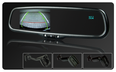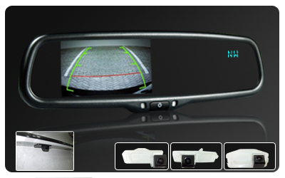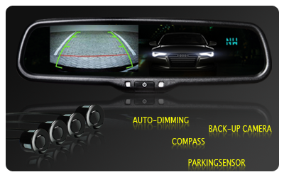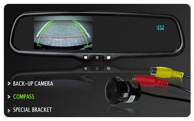 El monitor de 4.3 pulgadas de espejo retrovisor consiste en estas funciones: atenuación electrónica, brújura, cámara de la vista trasera, sensor de aparcamiento, temperatura, la luz PRNDL. Detrás del cristal del espejo retrovisor se instala la pantalla de 4.3 pulgadas de alta definición. Esta instalación es tan fácil que puede usar un soporte especial a juego del coche original para sustituir al espejo del original.